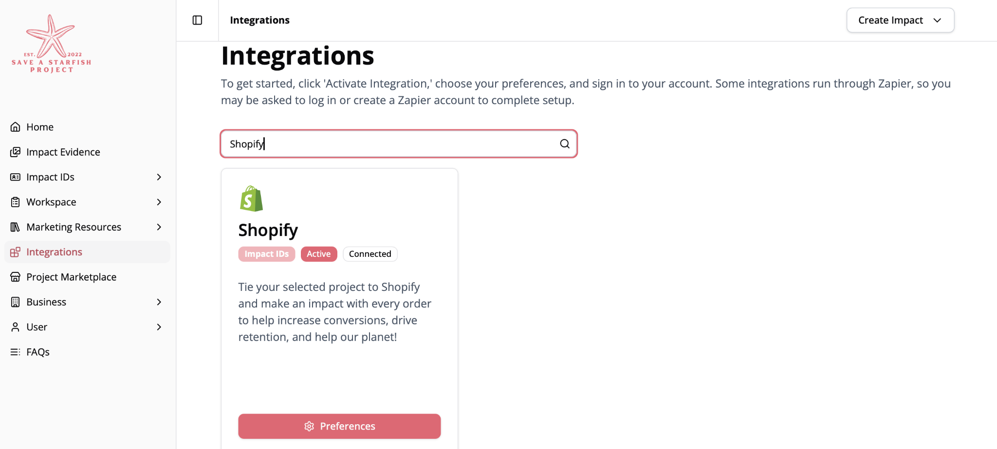 Once you’ve selected a project inside your Project Marketplace, you’re ready to integrate that impact into the platforms your brand uses every day. This guide walks you through setting up your Shopify integration inside your Impact Portal.