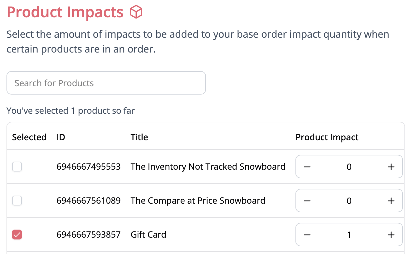 Apply impact to specific SKUs in your Shopify catalog.